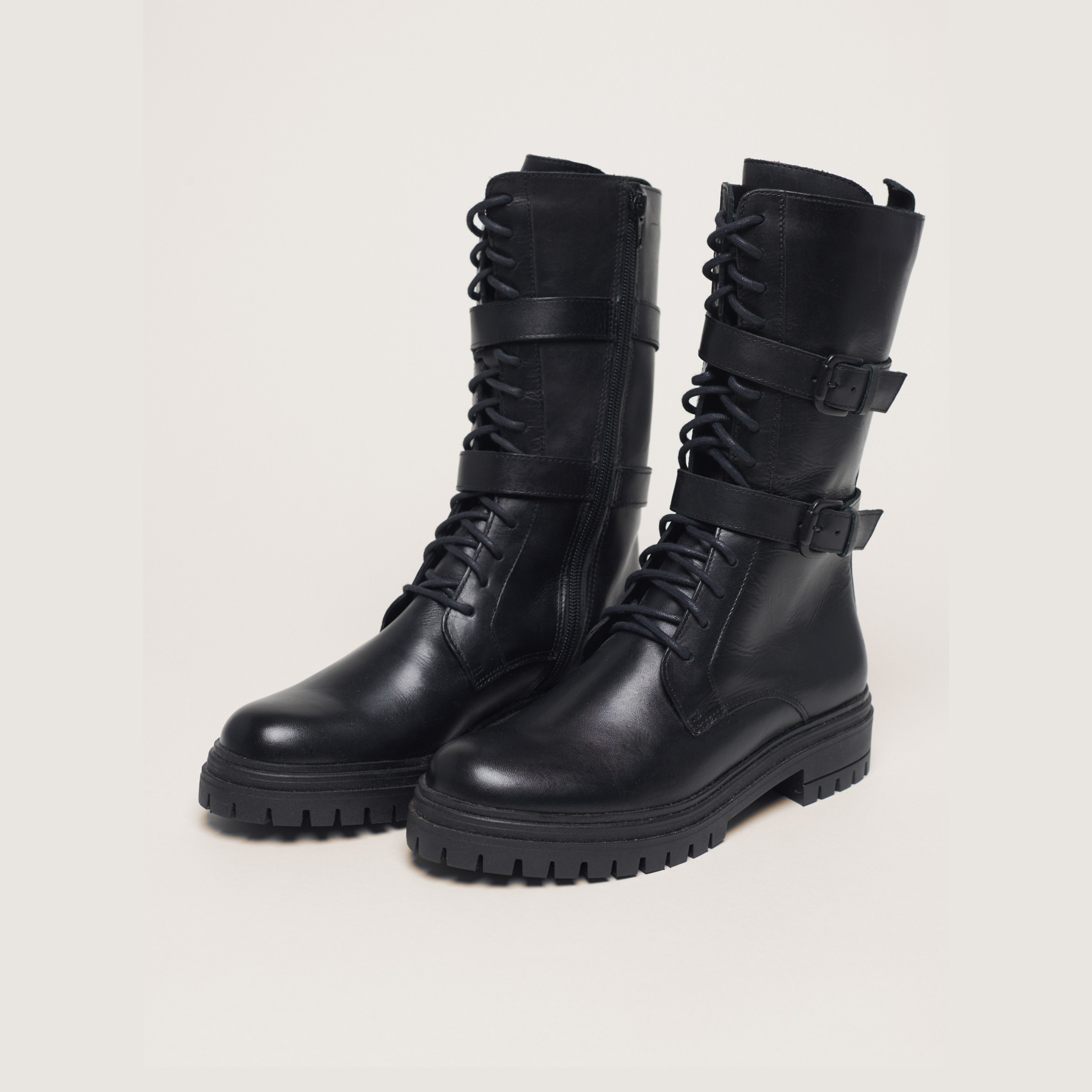 Bota coturno de couro com bico redondo fechado e cano tamanho mídi. Possui fechamento frontal por amarração e fechamento lateral por zíper. Possui palmilha com espuma de alta densidade promovendo um ultra conforto e solado tratorado antiderrapante.