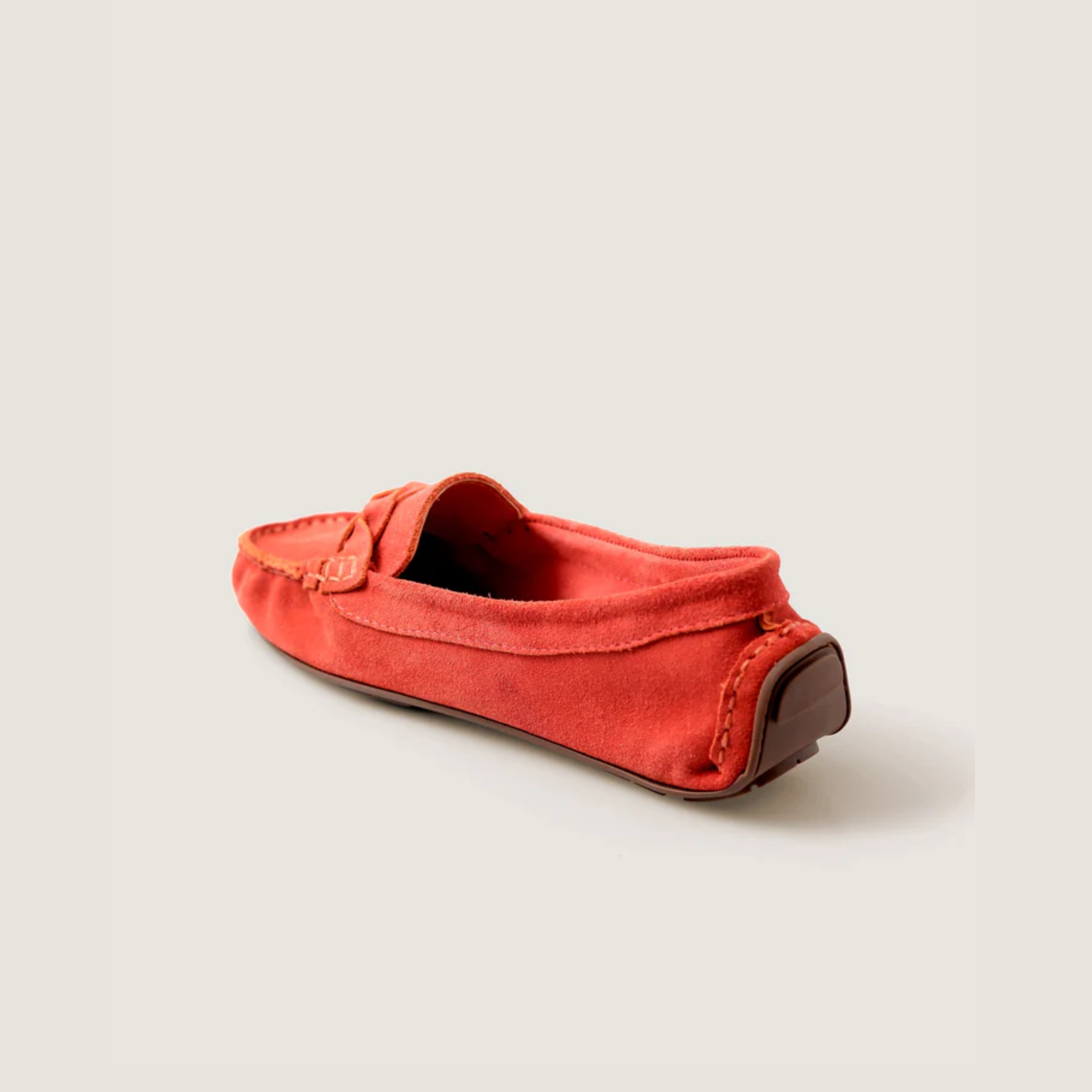 Mocassim em couro camurça com detalhe trançado na frente. Possui bico no formato amendoado, solado flexível e antiderrapante.