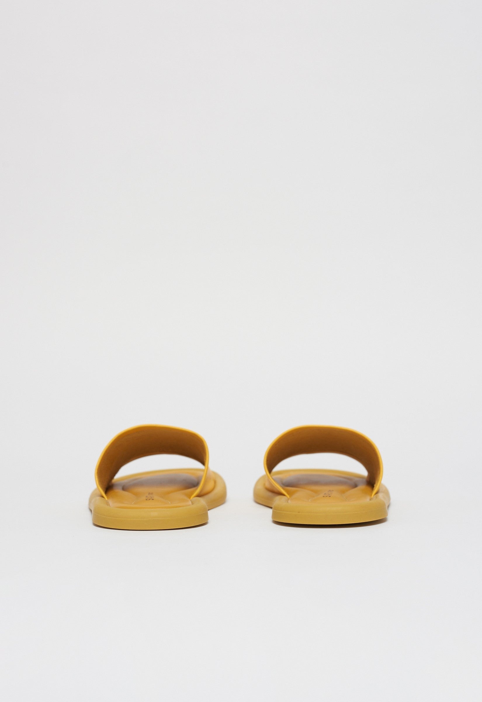 Rasteira tipo slide em couro colorido com tira única grossa e bico redondo aberto. Possui palmilha com espuma de alta densidade, tornando a sandália confortável e solado antiderrapante garantindo estabilidade ao calce.