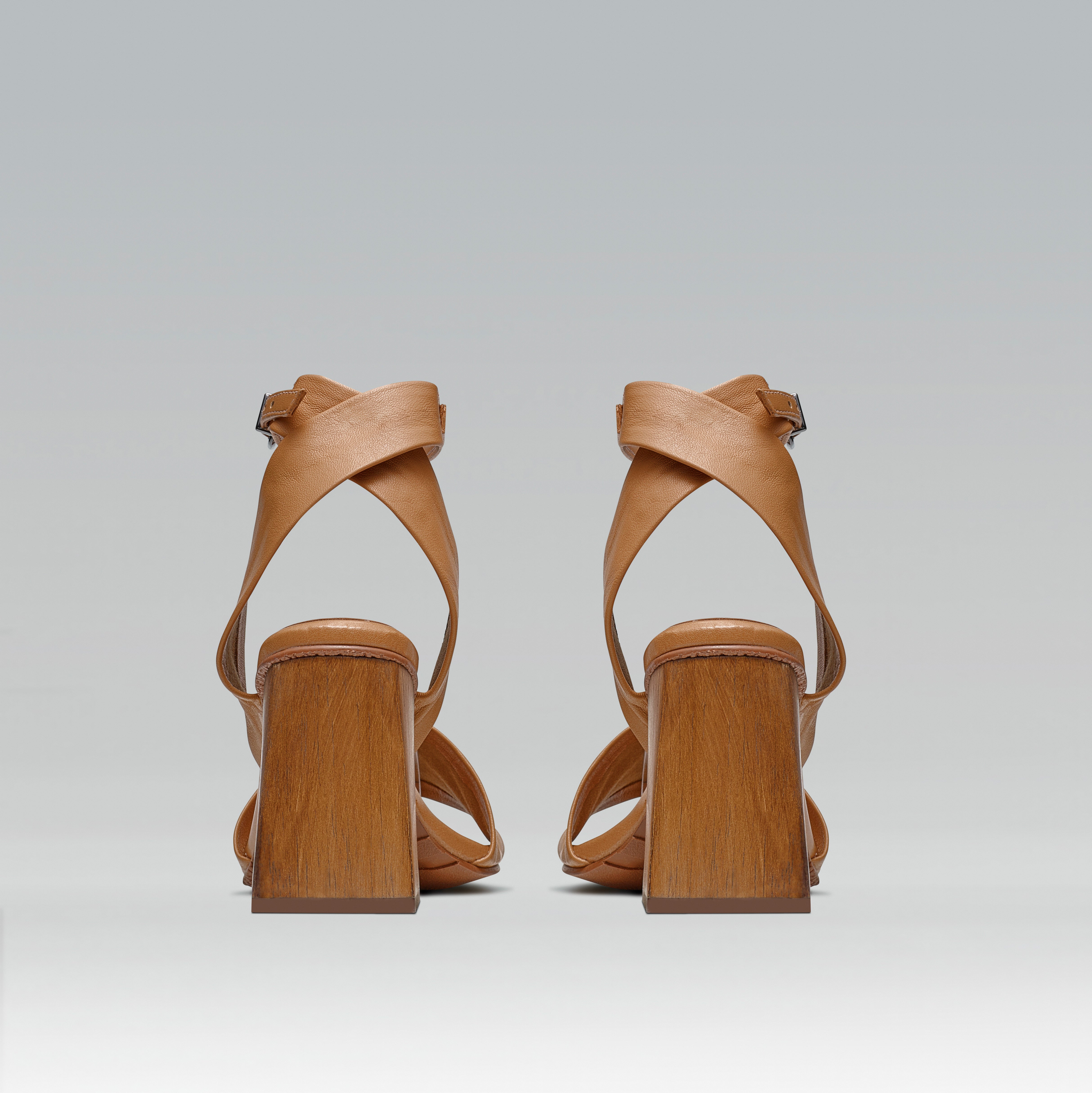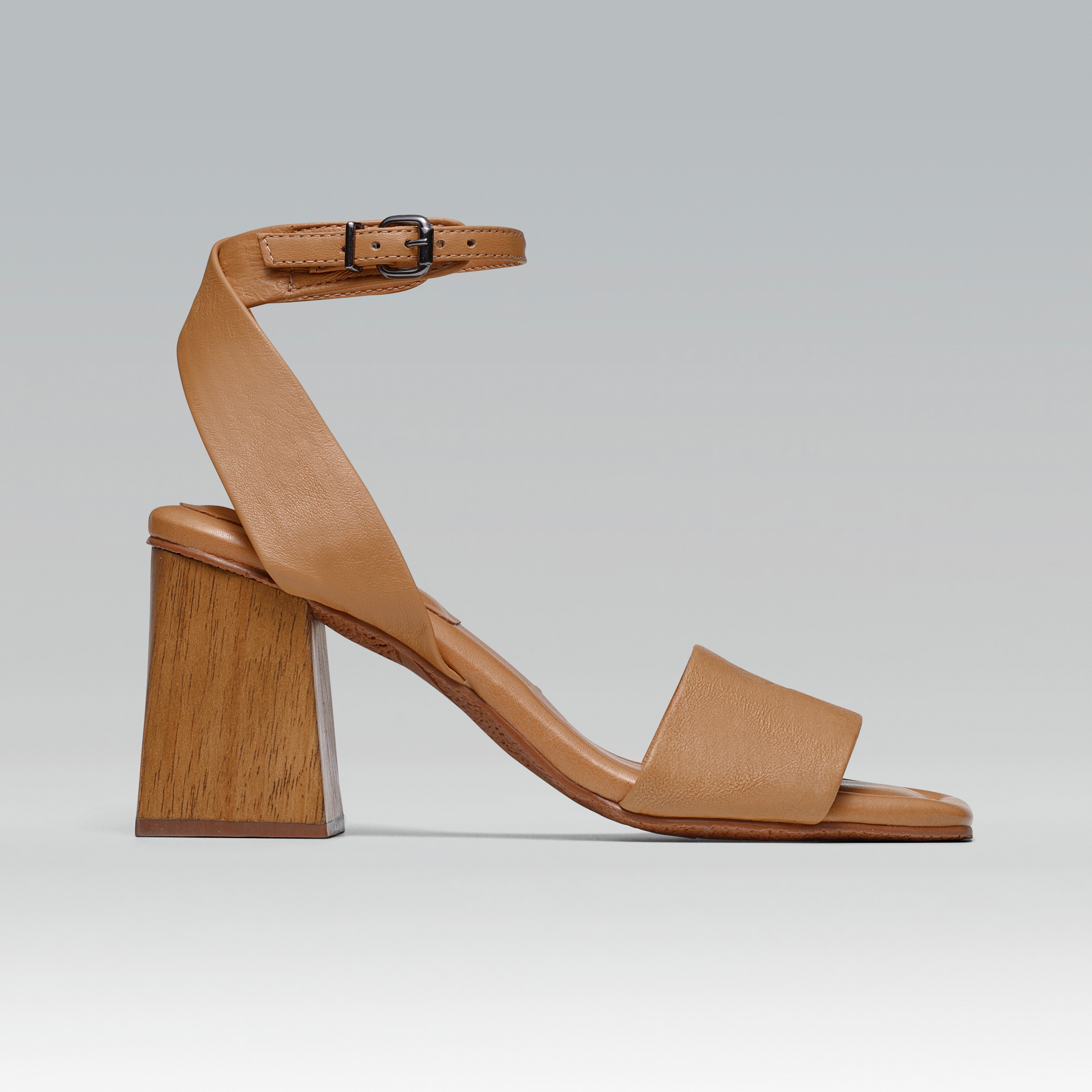 Sandália de Couro Salto Bloco Madeira Helena Camel